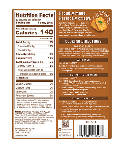 These delicious, golden brown hash brown patties come from real Idaho® Potatoes. A popular classic for breakfast or snack, these patties are easy to cook in the air fryer, oven, or stovetop skillet.