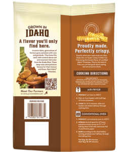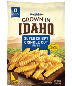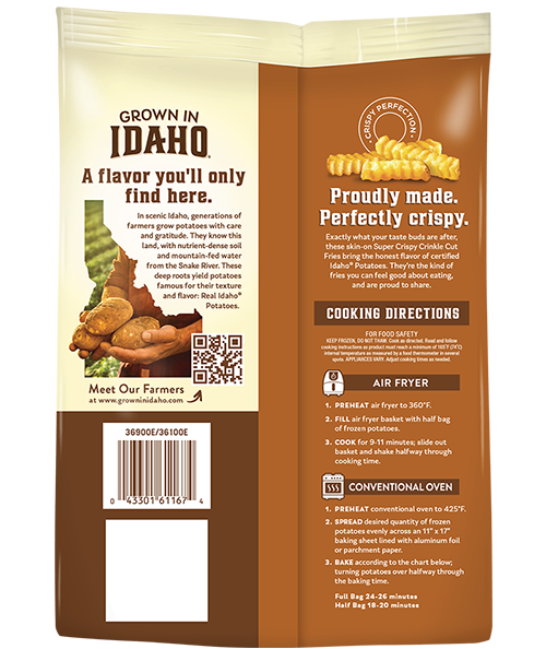 These skin-on, super crispy, crinkle cut fries are made with real Idaho® Potatoes. They bake up hot and crispy on the outside and fluffy on the inside with a texture that's perfect for holding sauces and seasonings.