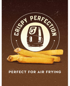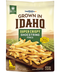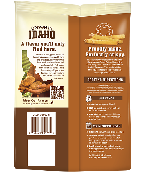 These skin-on, super crispy, shoestring cut French fries are made from real Idaho® Potatoes. They bake up hot and crispy on the outside and tender on the inside every time. With their higher crispy-to-fluffy ratio, these shoestrings really tie a meal together.