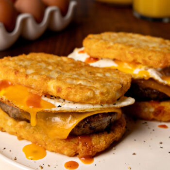 To assemble, layer a hash brown patty, sausage with melted cheese, and egg. Top with freshly ground black pepper and a splash of hot sauce. Cap with another hash brown patty and enjoy warm.
