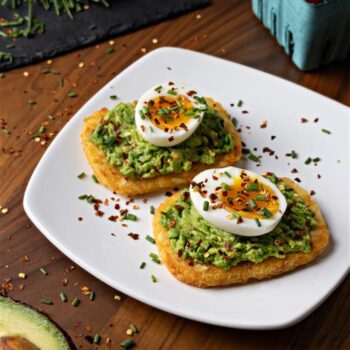 Begin assembling your avocado toast while the hash brown patties are still warm. Top with mashed avocado and one half of your boiled egg.